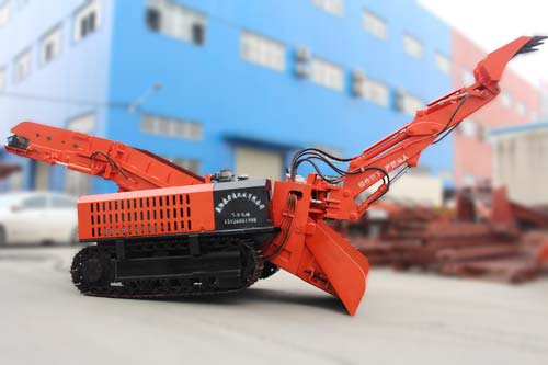 一、本機靠履帶推進扒取巖石送入自身的刮板輸送機,輸送機從尾部將巖石卸入自卸汽車或梭式礦車。同時可利用反鏟挖掘臂扒取遠處的巖石,也可以用鏟斗來清理工作面。