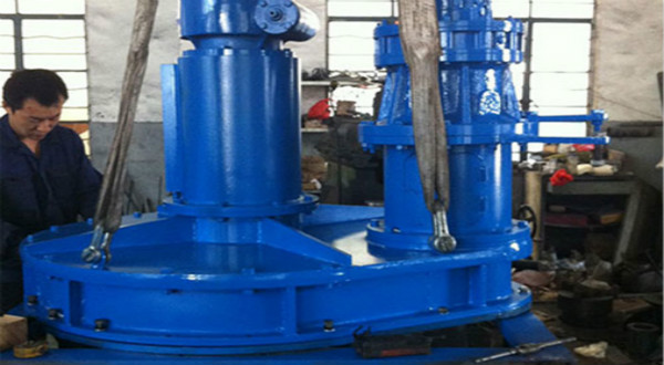 用于給水、污水處理工程中的沉淀池排泥,中心傳動(dòng)懸掛式整機(jī)載荷都作用于工作橋中心,不需中心支墩,簡(jiǎn)化了土建結(jié)構(gòu),一般用于直徑不大于16m的池體。中心傳動(dòng)懸掛式刮泥機(jī)整機(jī)主要由橋架、驅(qū)動(dòng)裝置、立軸、水下軸承、雙刮臂和刮泥板組成。其工作流程為:沉淀池污水經(jīng)工作橋下的進(jìn)水管流人導(dǎo)流筒,在導(dǎo)流筒傘形罩的均勻分配下呈擴(kuò)散狀流向池周,污泥依靠自重沉降于池底,刮板在刮臂的帶動(dòng)下緩慢旋轉(zhuǎn),經(jīng)分離后的上清液通過(guò)出水堰板排出池外,沉淀后的污泥由刮板沿池周刮向中心集泥坑,依靠液體靜壓作用經(jīng)排泥管排至池外。中心傳動(dòng)刮泥機(jī)的塑式有懸掛式和垂架式兩種,其運(yùn)轉(zhuǎn)方式又分半橋和全橋方式。對(duì)于中心傳動(dòng)濃縮刮泥機(jī),其刮臂上帶有濃縮柵條,一般用于污水處理廠中、小型輻流式濃縮池中,將進(jìn)一步分離的濃縮污泥排出濃縮池。